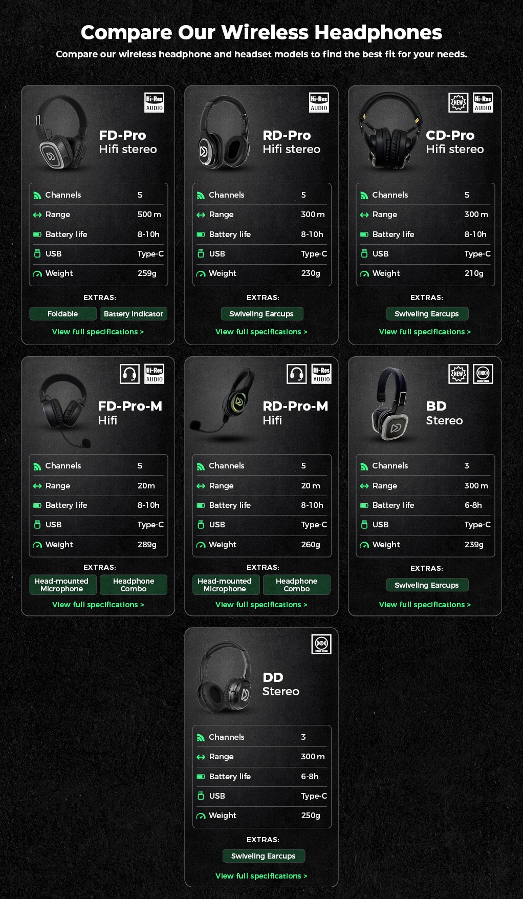 Bij Dolly Digital® maken we het kiezen van de juiste draadloze koptelefoon nu een stuk eenvoudiger. We hebben een helder overzicht samengesteld waarin al onze draadloze koptelefoons naast elkaar staan, inclusief hun belangrijkste verschillen. In één oogopslag zie je wat elk model uniek maakt: zo wordt er onderscheid gemaakt in het aantal kanalen, het bereik van de koptelefoon, de batterijduur, welke type USB aansluiting de koptelefoon heeft en het gewicht van de koptelefoon. Ook staan er onderscheidende kenmerken zoals of het geluid Hi-Fi is en of de koptelefoon ook een head-mounted microfoon heeft. Type Dolly Digital® DD headphones worden geleverd in classic Micro USB voor backwards compatibiliteit. Indien u wenst kunt u bij de bestelling aangeven liever USB-C geleverd te krijgen.